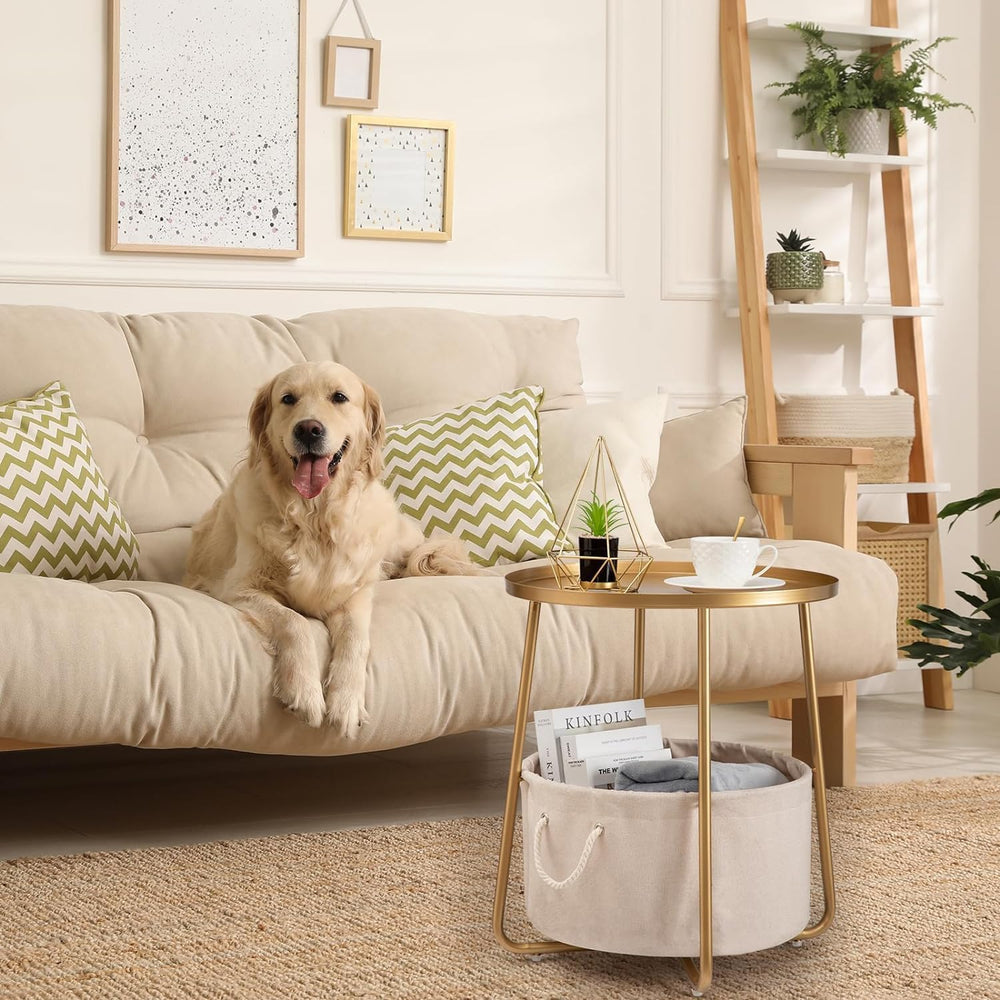 danpinera Gold Beistelltisch, Kleiner runder Beistelltisch mit Aufbewahrungskorb aus Stoff, Beistell