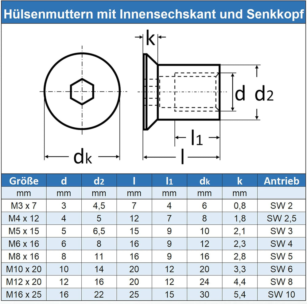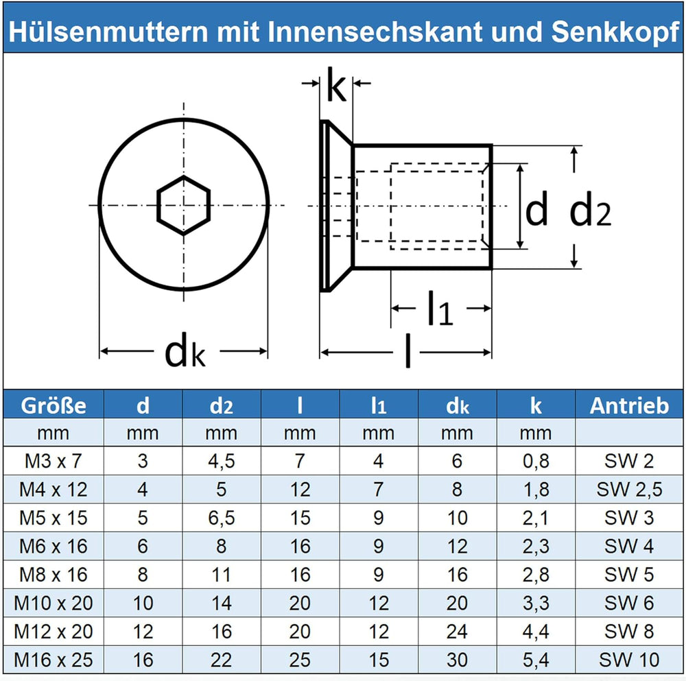 M8 x 16 mm Hülsenmuttern mit Senkkopf und Innensechskant (30 Stück) - Edelstahl A1 1.4305 - rostfrei