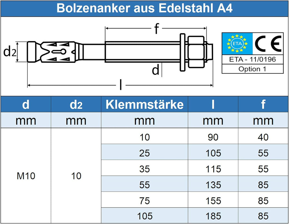 Eisenwaren2000 | M10 x 115/35 mm Bolzenanker (5 Stück) - ETA-Zulassung - Schwerlastdübel - Edelstahl
