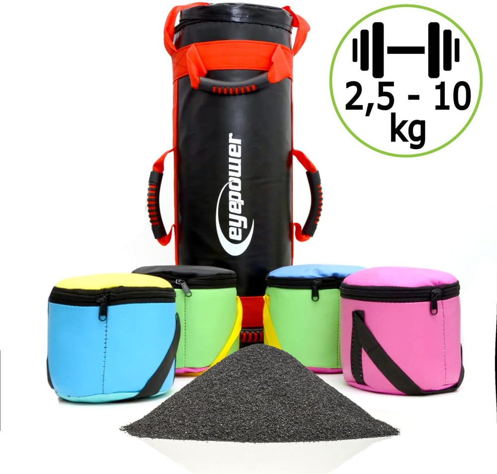 EYEPOWER 10kg Power Bag + 4 Kettlebell Gewichte - Befüllt mit Eisensand - Besser als Geräte: 6 Griff