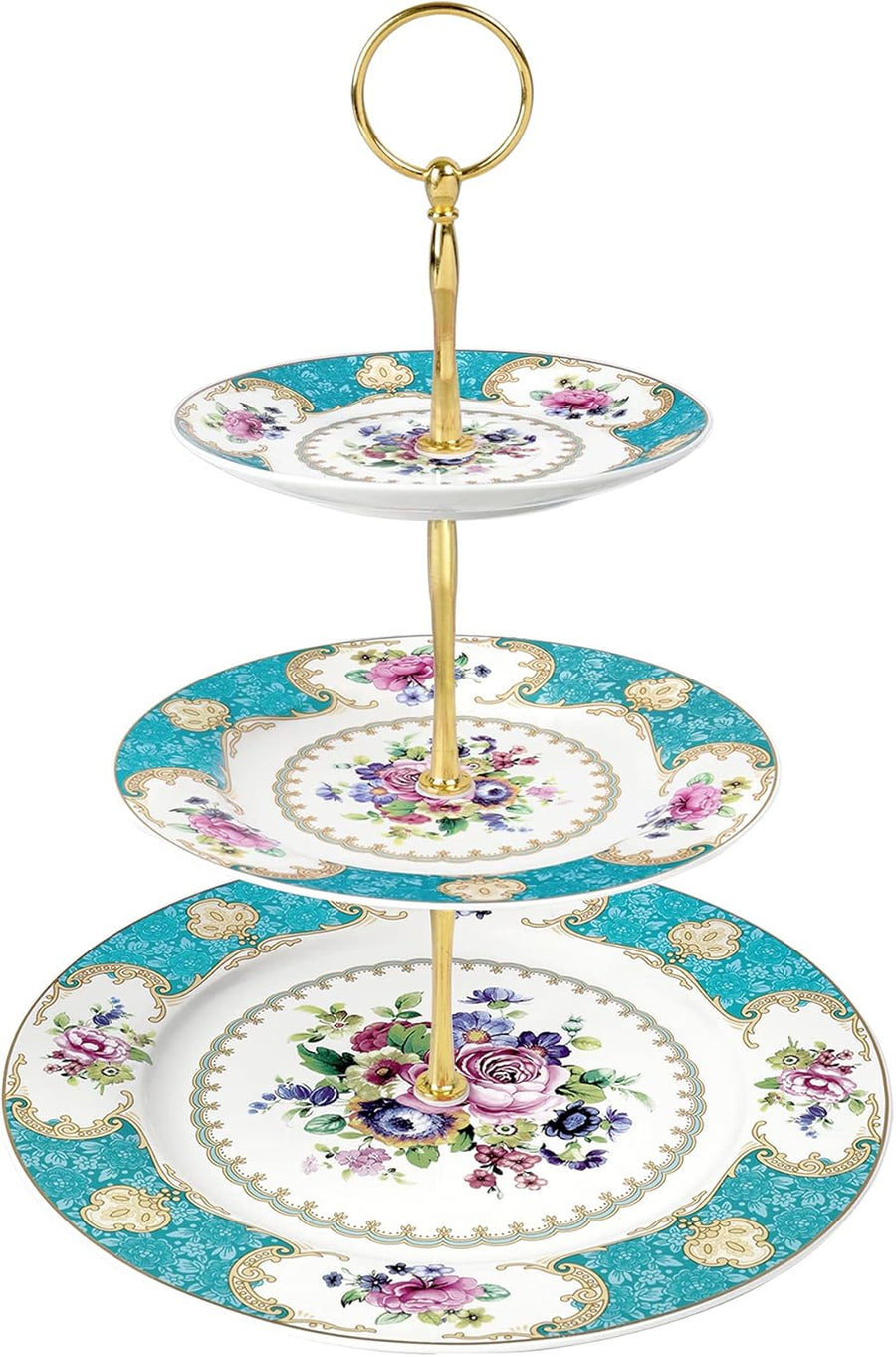 fanquare 3 Stufig Porzellan Tortenständer, Blau Blumen Vintage Cupcake Ständer, Anzeigeturm Tablett