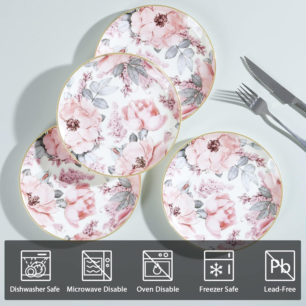 fanquare 4 Stück Dessertteller aus Porzellan Set Ø 208 mm Frühstücksteller mit Goldrand, Rosa Blumen