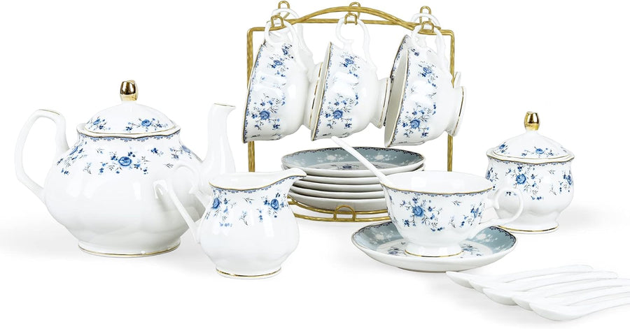 fanquare 21 Stück Porzellan Teeservice, Blau Blumen Tee Set, Englische Kaffeeservice Set mit Teekann
