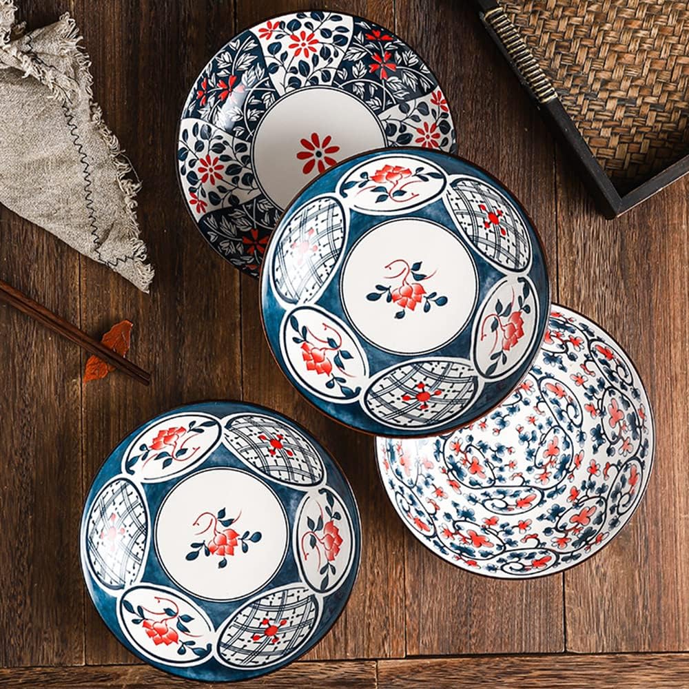 fanquare 6-er Teller-Set Porzellan Japanischer Stil, Blaue Blätter und Rote Blumen Flache Desserttel