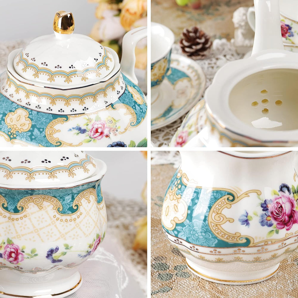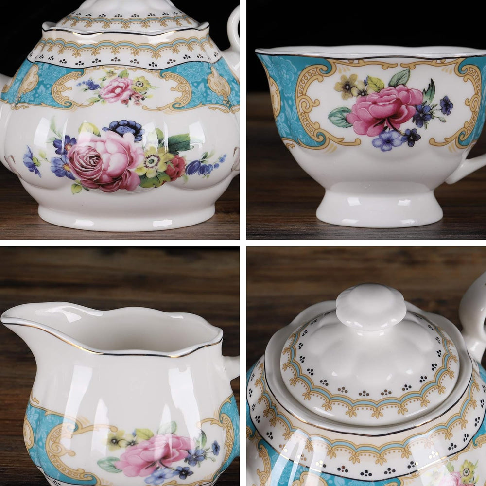 fanquare 15 Stück Englisch Türkis Porzellan Tee Sets,Vintage Rose Blumen Keramik Kaffee Set,Hochzeit