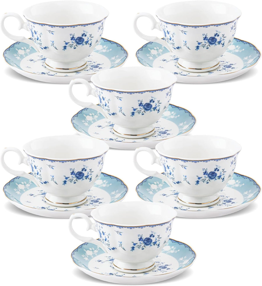 fanquare Blaues Blumenmuster-Teetassen- und Untertassen-Set, 6-teilig, elegante britische Porzellan-