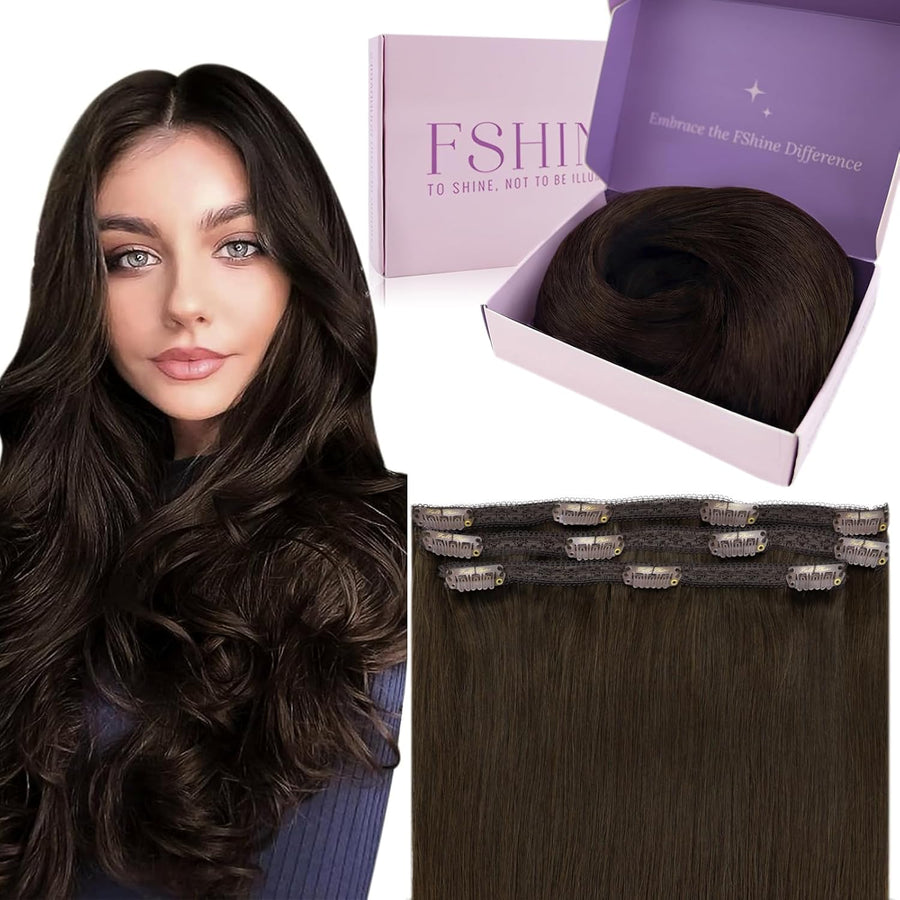 Fshine Echthaar Extensions Clip 45cm Dunkelstes Braun 120 Gramm Doppelt Tressen Haarverlängerung Rem