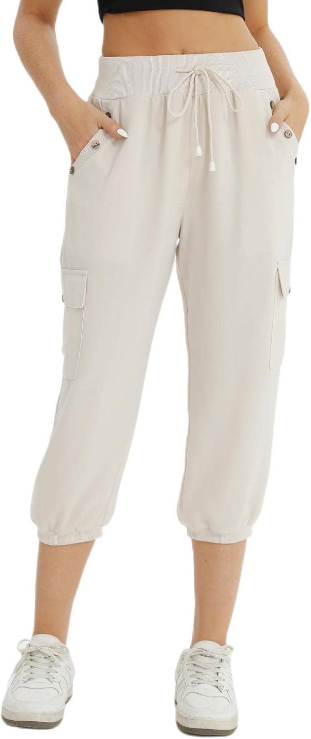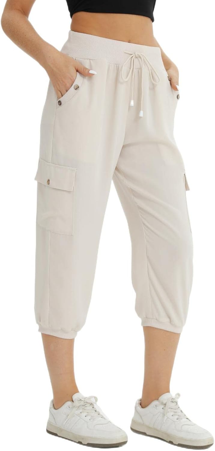 fuinloth 3/4 Hose Damen, Sommer Caprihose Dreiviertel Cargo Hosen Frauen Gummizug Leicht 38-40 Aprik