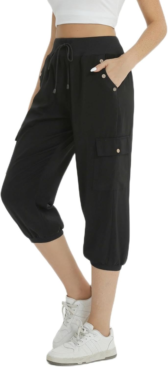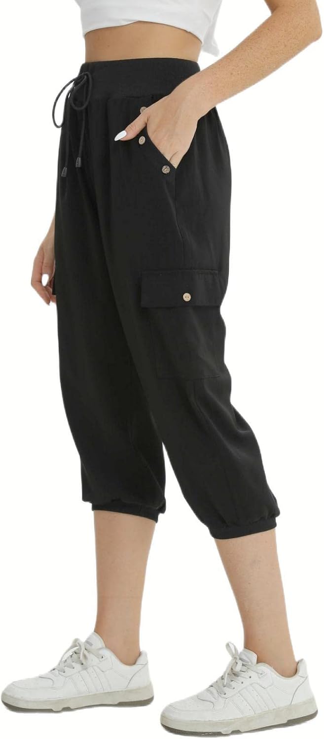 fuinloth 3/4 Hose Damen, Sommer Caprihose Dreiviertel Cargo Hosen Frauen Gummizug Leicht 36-38 Schwa