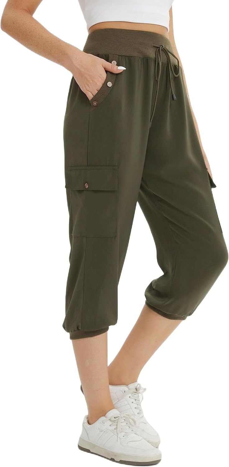 fuinloth 3/4 Hose Damen, Sommer Caprihose Dreiviertel Cargo Hosen Frauen Gummizug Leicht 38-40 Armee