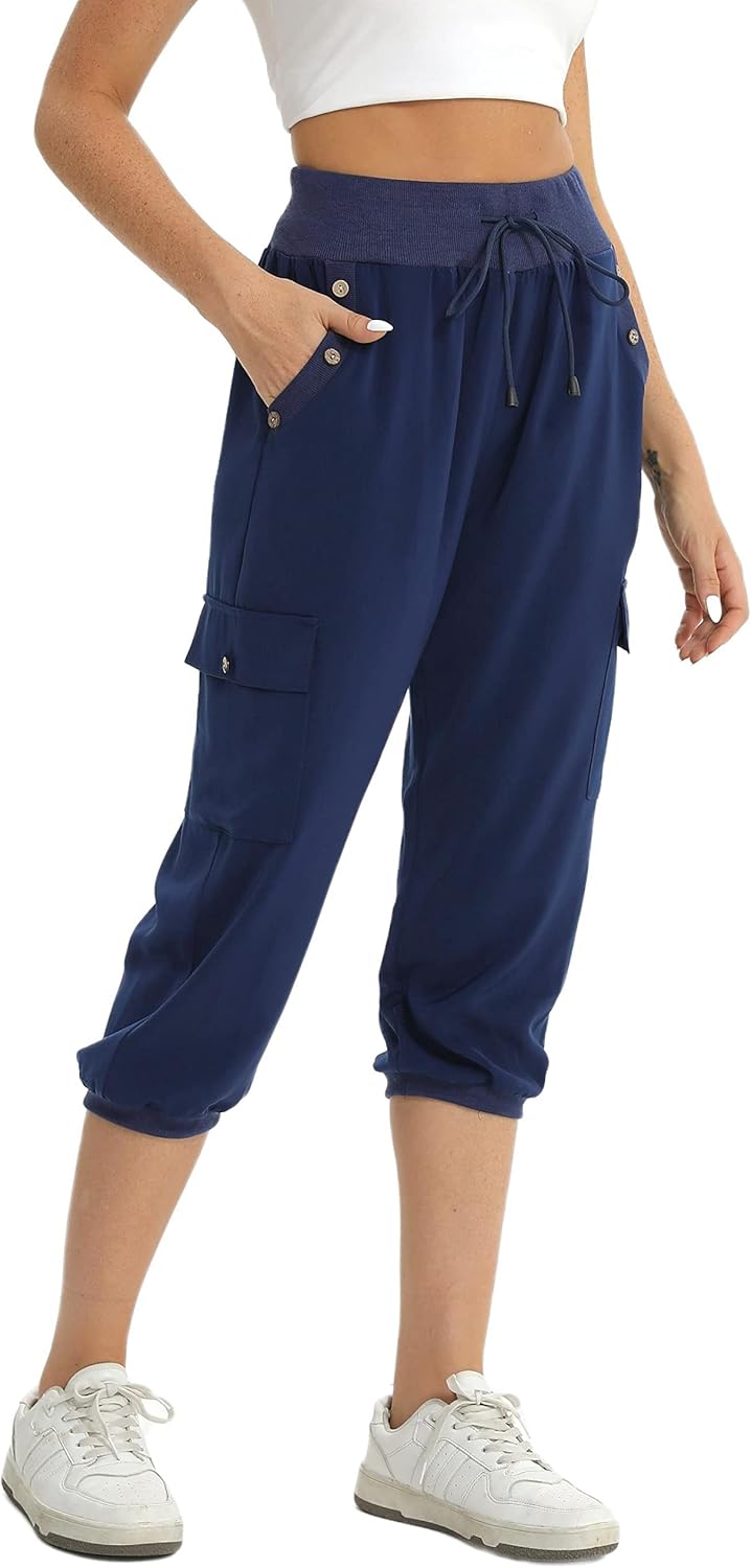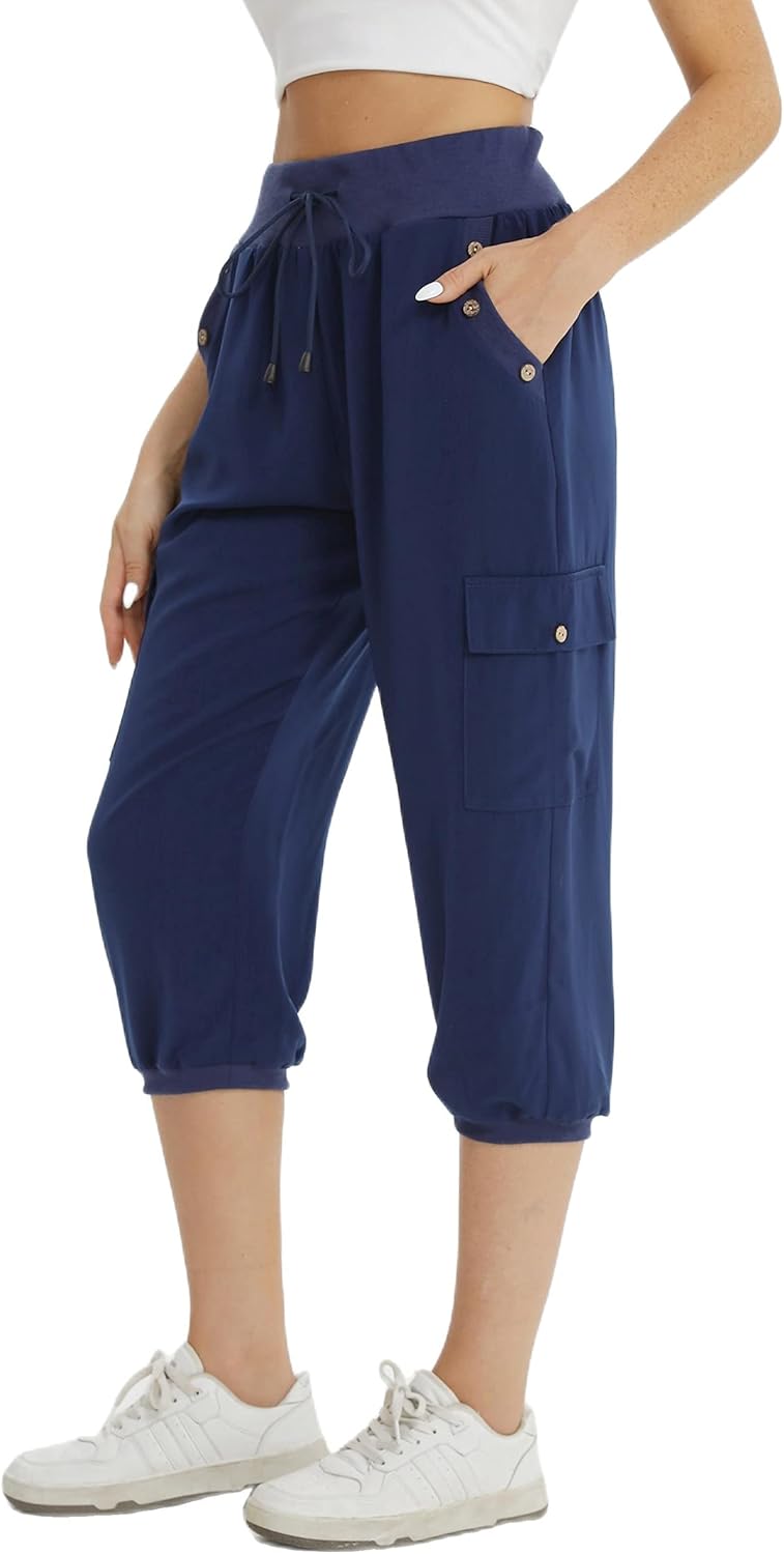 fuinloth 3/4 Hose Damen, Sommer Caprihose Dreiviertel Cargo Hosen Frauen Gummizug Leicht 34-36 Navy