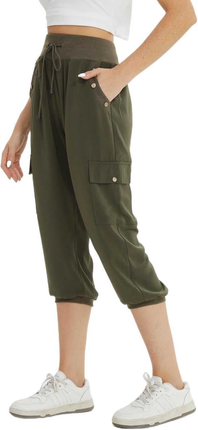 fuinloth 3/4 Hose Damen, Sommer Caprihose Dreiviertel Cargo Hosen Frauen Gummizug Leicht 38-40 Khaki