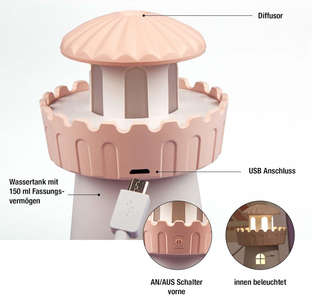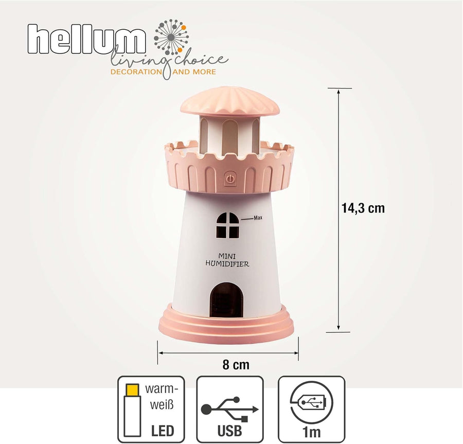 Hellum Luftbefeuchter dekorativ, tragbarer Mini Luftbefeuchter Leuchtturm in rosa, Leuchtturm Diffus