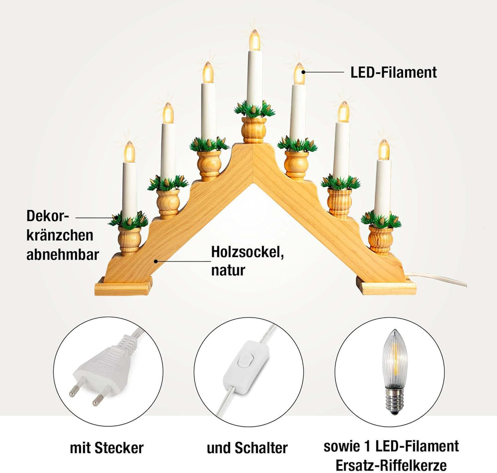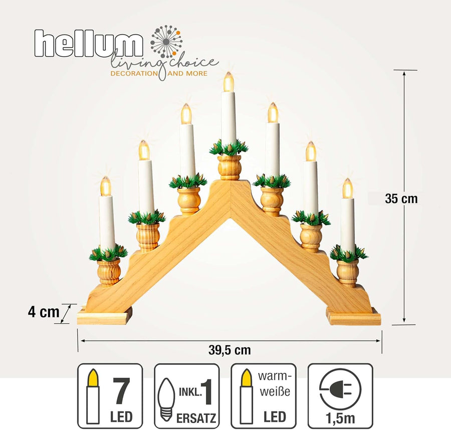 Hellum Schwibbogen Weihnachten für innen, Fensterbeleuchtung Weihnachten, 39x34cm naturfarben mit 7