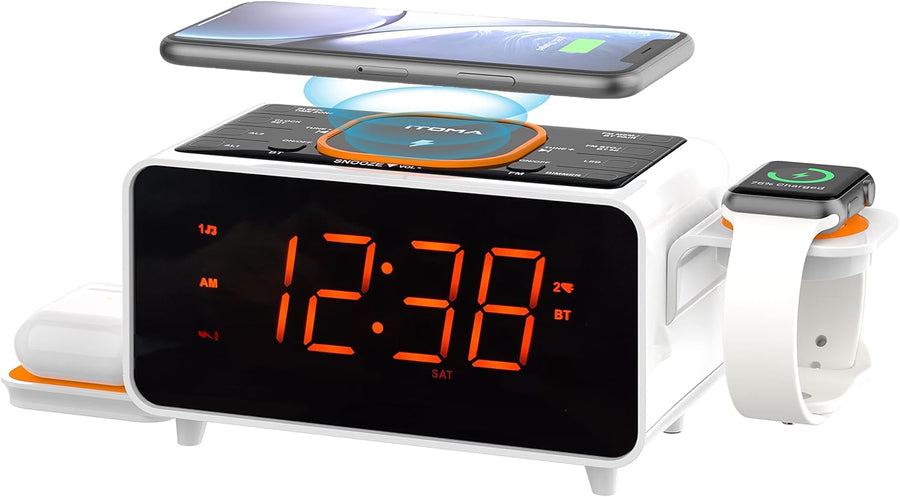 iTOMA Dual Wireless Charging Radiowecker mit Bluetooth Lautsprecher, FM Radio, Zwei USB Port, Dual A