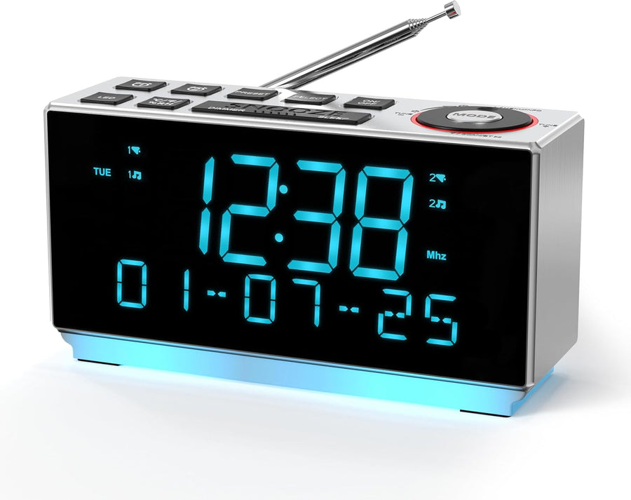 Radiowecker mit USB-Ladegerät, Bluetooth-Lautsprecher, Kabelloses Laden, Dual Wecker, LED Nachtlicht