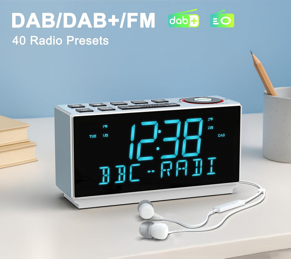 DAB+ & FM-Radiowecker mit Bluetooth, 40 Voreinstellungen, Kopfhörer, Dual-Weck mit Schlummer und Sch