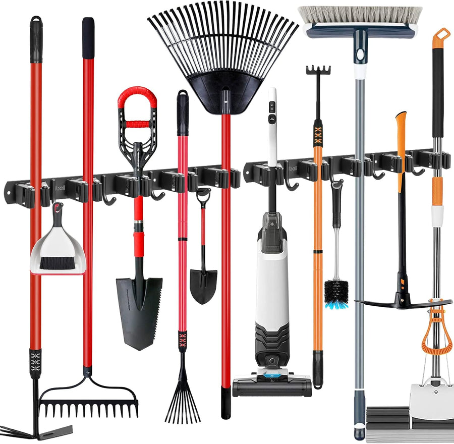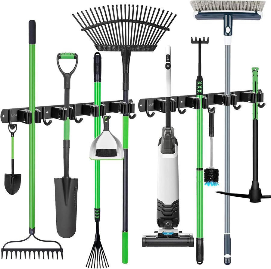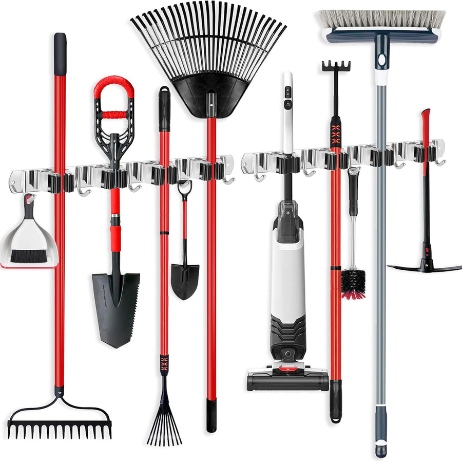 2 Stück Besenhalterung Wand, ibell Gerätehalter Edelstahl mit 4 Halter und 5 Haken, Gartengerätehalt
