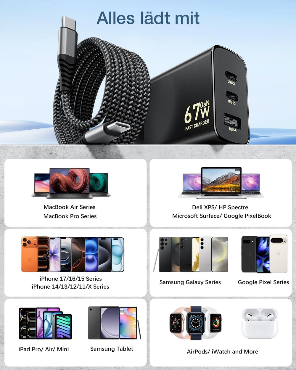 67W USB C Ladegerät 3-Port USB C Netzteil PD Charger 65W PPS Schnellladegerät für MacBook Pro/Air, i