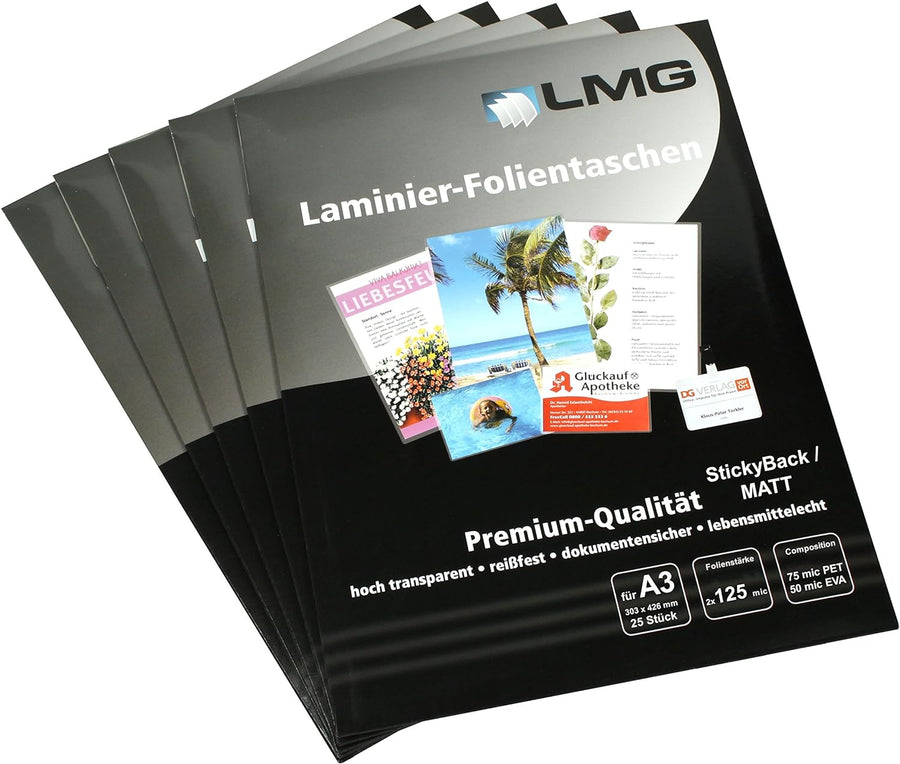 LMG LMGA3-125SM-25 Laminierfolien A3, 303 x 426 mm, 2 x 125 mic mit selbstkl Rückseite, 25 Stück