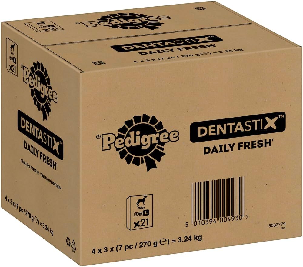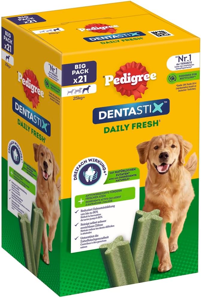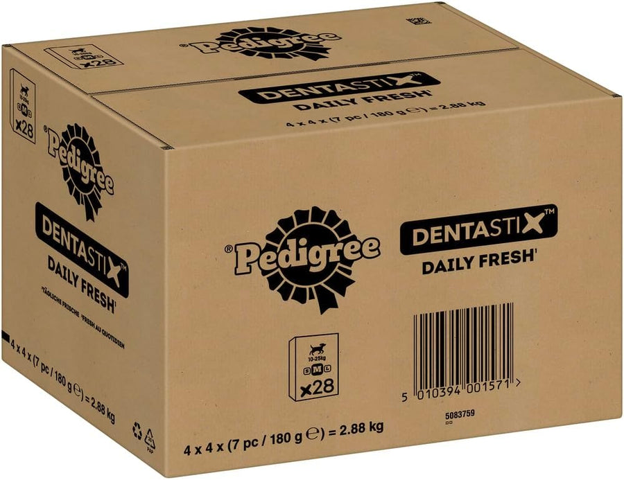 Pedigree DentaStix Daily Fresh Zahnpflegesnack für grosse Hunde (+25kg), 112 Sticks, 4er Pack, 4x28