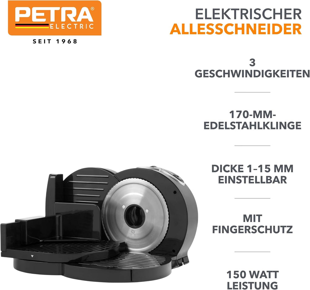 Petra PT3683VDEEU10 Elektrischer Allesschneider, Schneidemaschine für Aufschnitt, Brot und Käse, 3 G