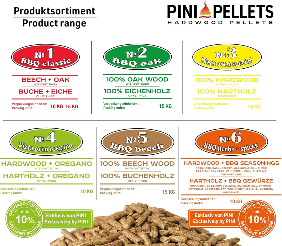 PINI Hartholz Pellets № 4 BBQ Pizza Oven Oregano 10 Kg Grillpellets zum Grillen Räuchern Smoken und