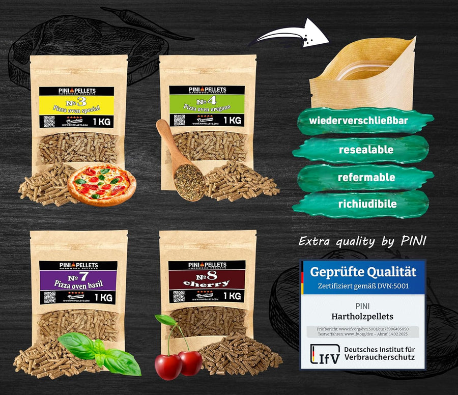 PINI Naturholzpellets Set 4X 1 kg für Pizzaofen aus 4 Sorten - Pizzapellets Nr 3, Oregano Nr. 4, Bas