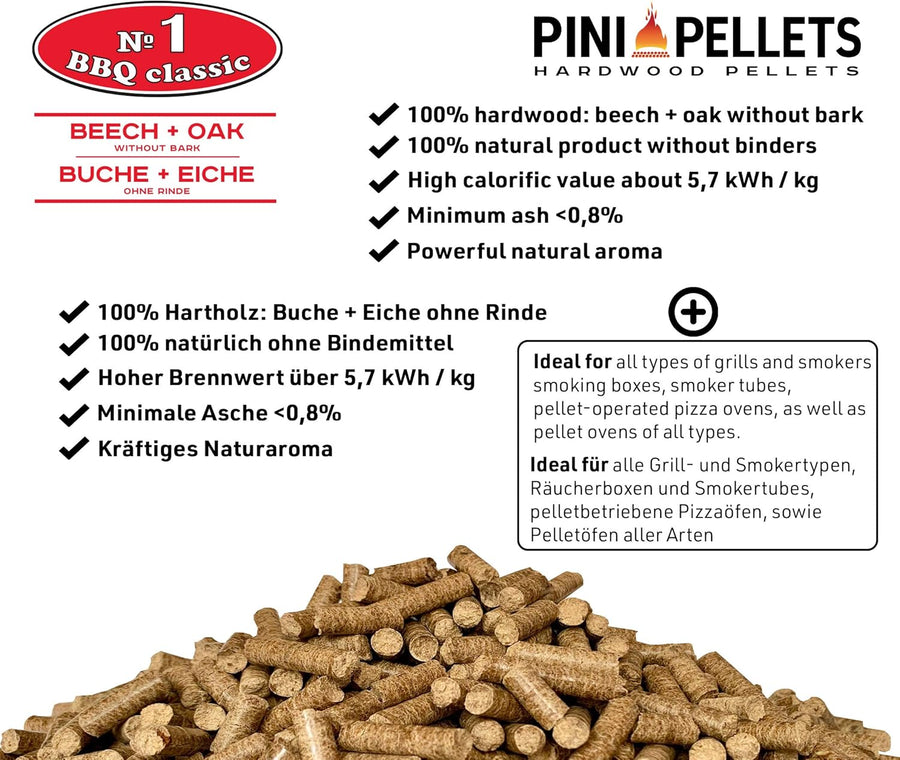 PINI Hartholz Pellets 100% Buche № 5 BBQ Beech 15 Kg Grillpellets zum Grillen Räuchern Smoken