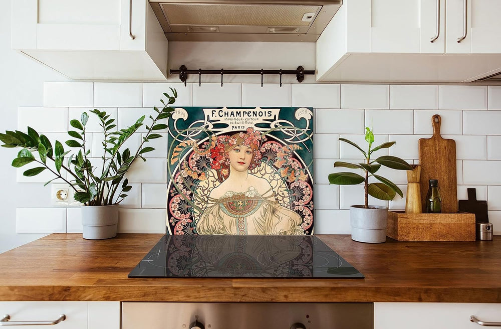 Alfons Mucha - Frau umringt von Blumen Herdabdeckplatte & Spritzschutz aus Echtglas | Für Herd-Kochf