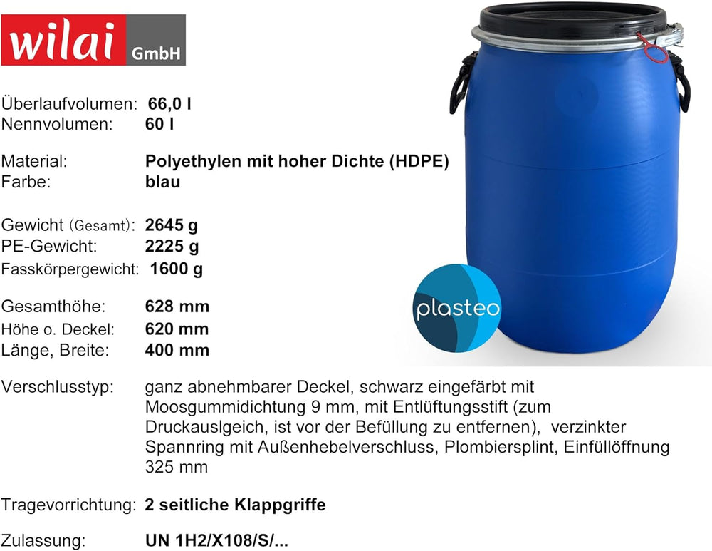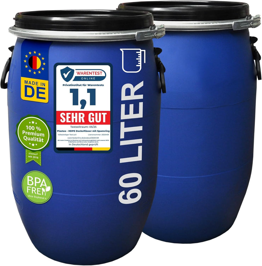 plasteo® 2 Stück: 60 L Weithalsfass mit Spannverschluss | 100% Lebensmittelecht | Universalfass | Fu
