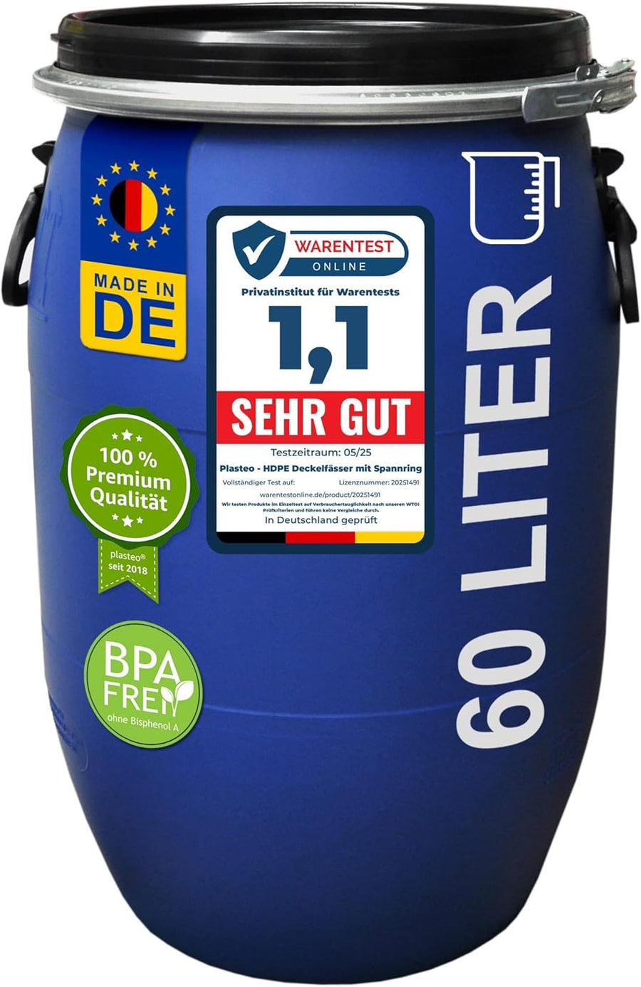 plasteo® 60 Liter Deckelfass Weithalsfass mit Spannverschluss | Futtertonne | Universalfass | Lagerf