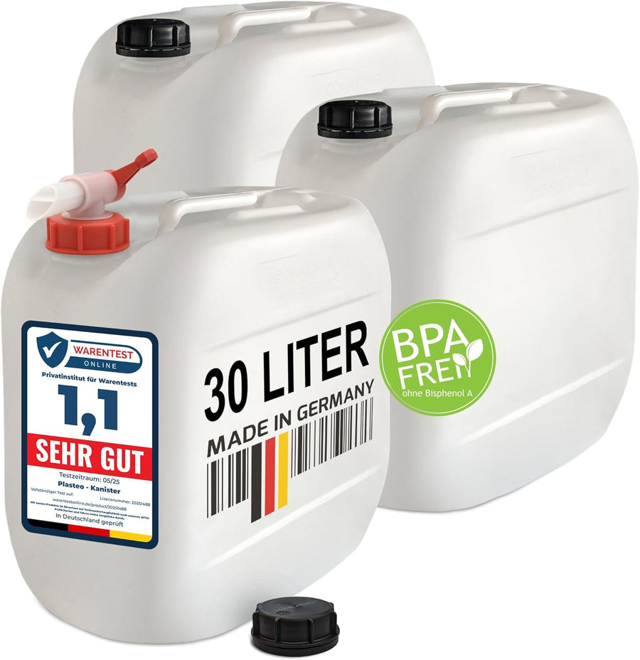 plasteo® 3er Set: 30 Liter Getränke u.Trinkwasserkanister Wassertank Behälter Natur mit 1 Hahn und 3