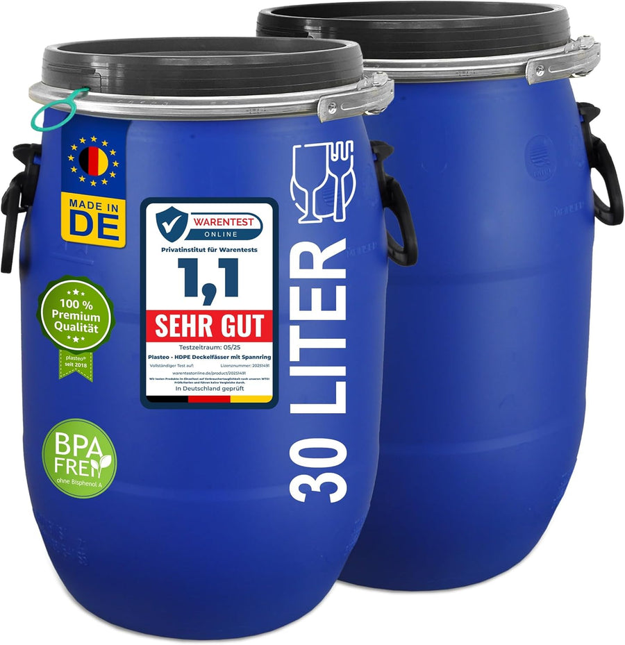 plasteo® 2 Stück 30 Liter Deckelfass lebensmittelecht FDA-Zulassung UN-Zulassung IKG Gütezeichen Kun