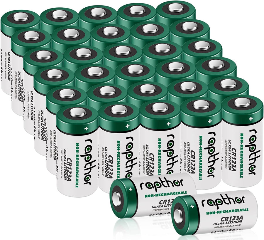 Rapthor CR123A 3V Lithium Batterie 32er Pack 1650mAh für Arlo Kamera, Polaroid, Taschenlampe, hohe K