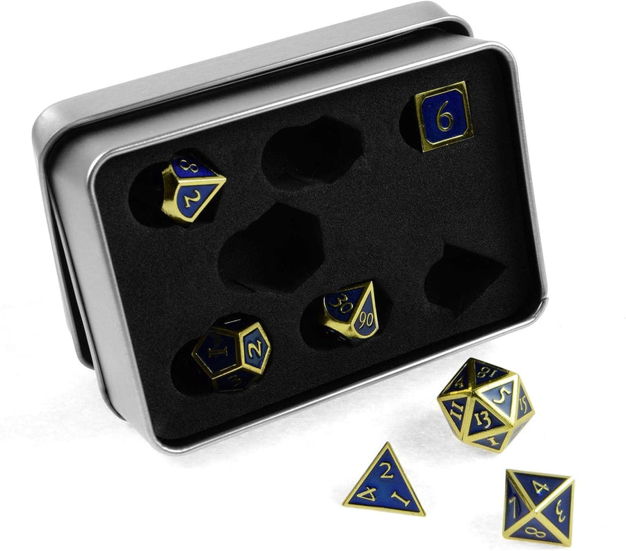 shibby 7 polyedrische Metall-Würfel für Rollen- und Tabletopspiele in Steampunk Gold-blau-Optik inkl