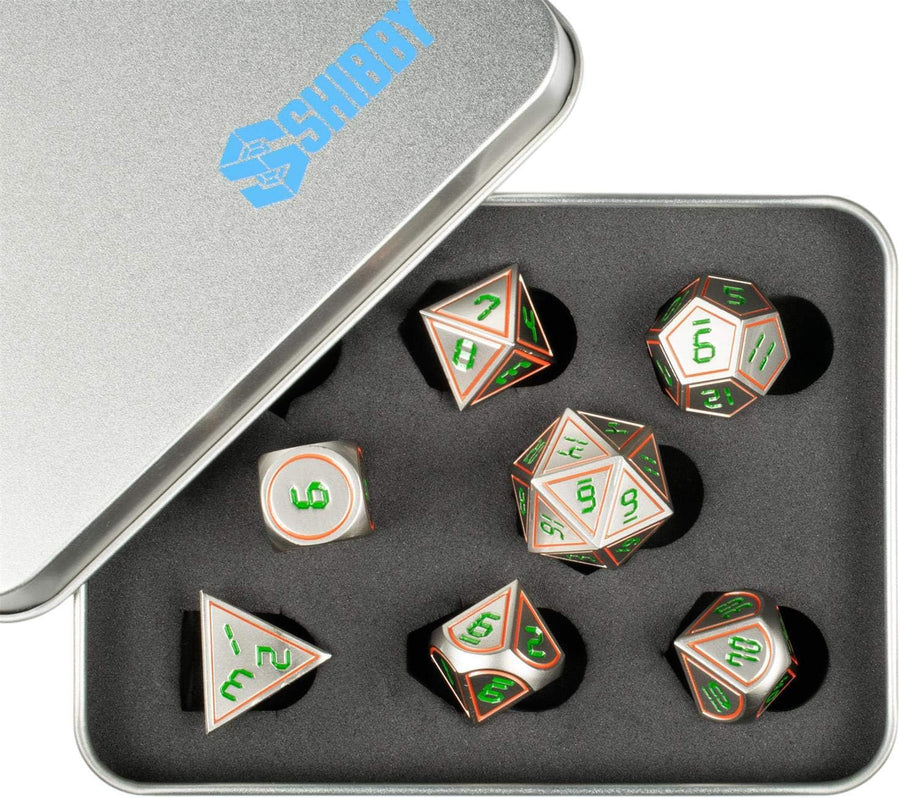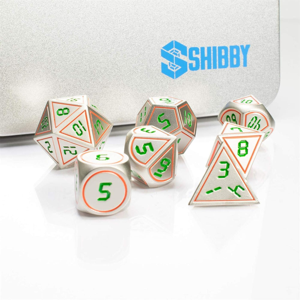 shibby 7 polyedrische Metall-Würfel für Rollen- und Tabletopspiele in Digital Optik D3 inkl. Aufbewa