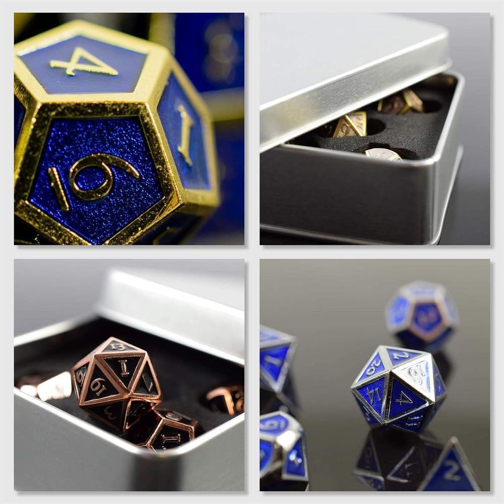 shibby 7 polyedrische Metall-Würfel für Rollen- und Tabletopspiele in Steampunk Silber/Blau-Optik in