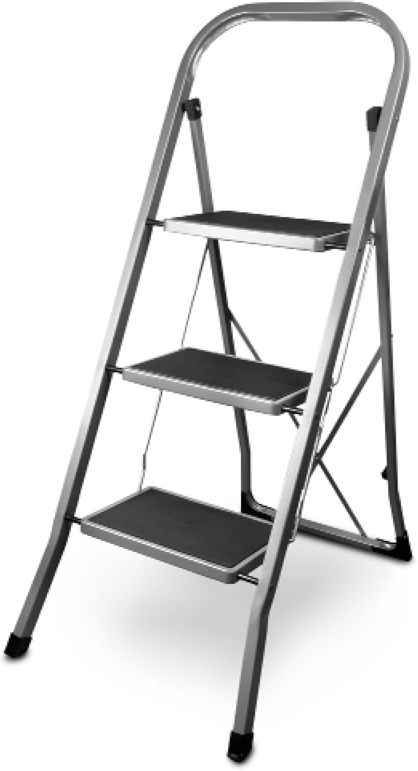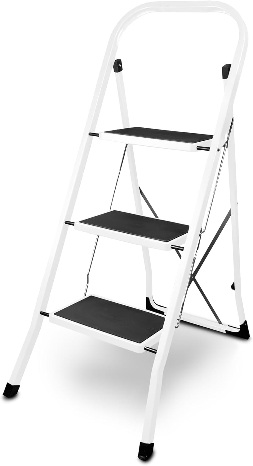 siwitec Klapptritt aus Stahl mit 3 Stufen, Weiss, kleine Leiter mit Anti-Rutschmatten, 150 kg Tragla