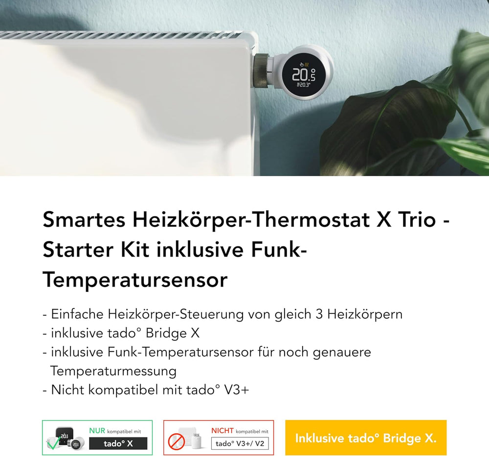 tado° Smartes Heizkörperthermostat X – Starter Kit mit Bridge X, Trio Pack & Funk-Temperatursensor,