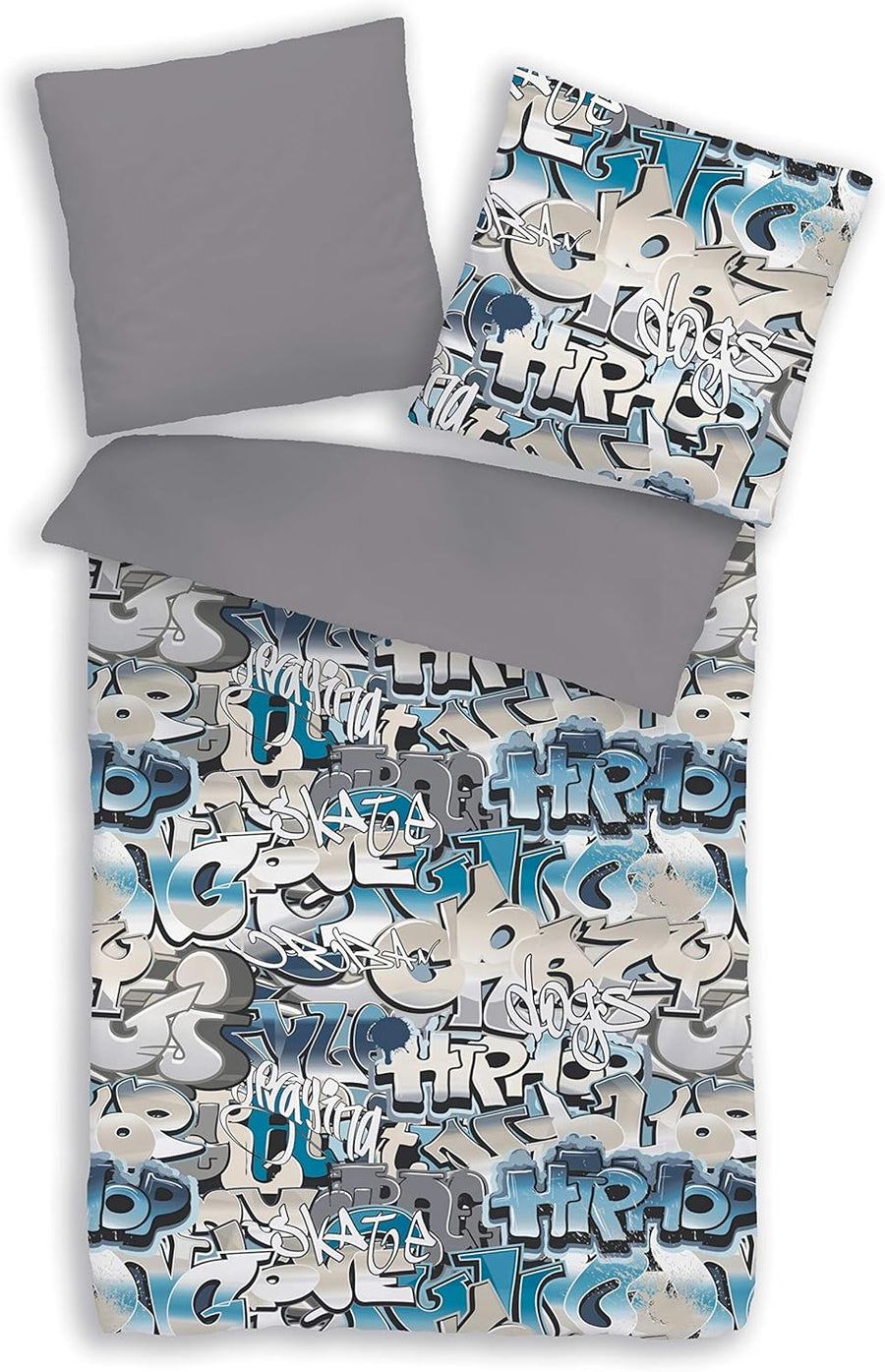 termana Graffiti Bettwäsche Set 155x220 + 80x80 · 100% Baumwolle, Reissverschluss, blau, grau · 3D T