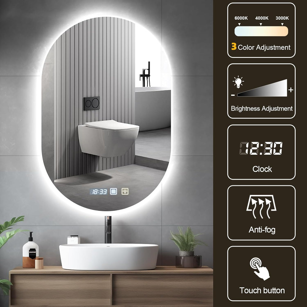 Badspiegel Rund mit Beleuchtung 50 cm x 75 cm, Badspiegel Rund mit Uhr, LED, Dimmbar, 3 Lichtfarben,
