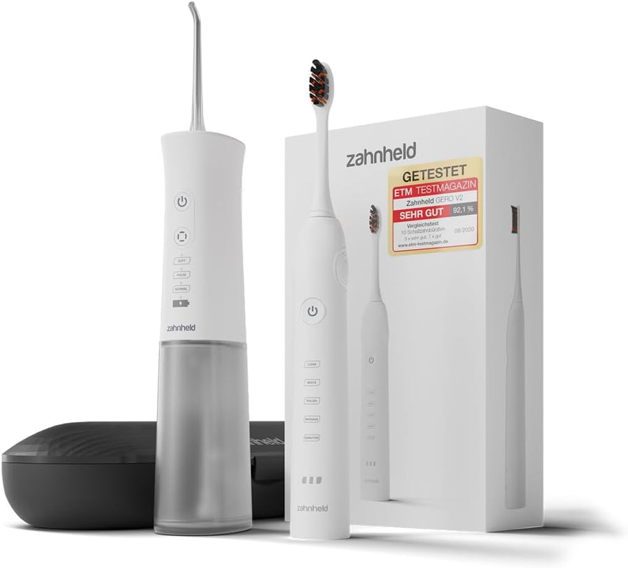 Zahnheld® Super-Set, elektrische Schallzahnbürste GERO + Munddusche AQUADENT | inkl. Bürstenkopf & R