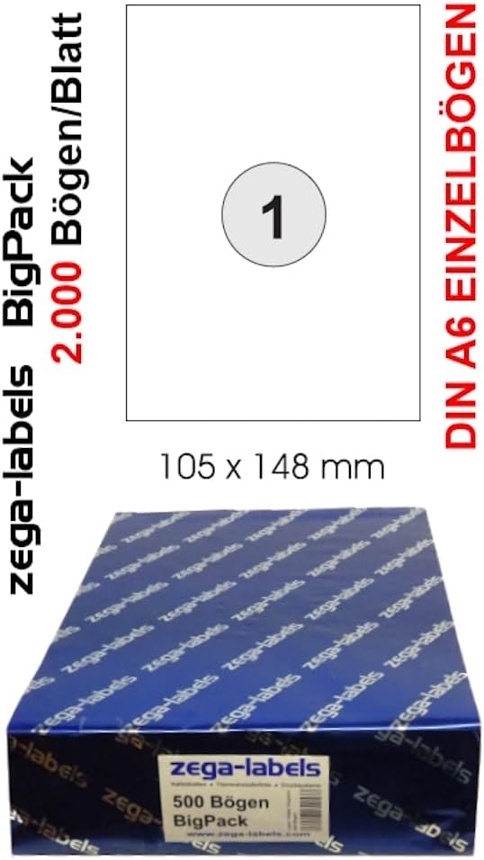 2.000 Etiketten 105 x 148 mm selbstklebend einzeln = DIN A6 Bögen (1x1 Etikett DIN A6) - 2.000 Blatt
