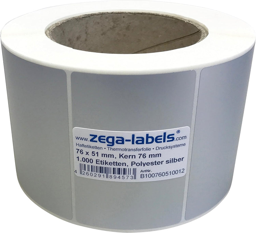 Polyester Thermotransfer Etiketten auf Rolle - 76 x 51 mm - aus PET Polyesterfolie silber für Typens