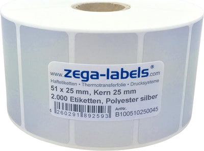 Polyester Thermotransfer Etiketten auf Rolle - 51 x 25 mm - aus PET Polyesterfolie silber für Typens