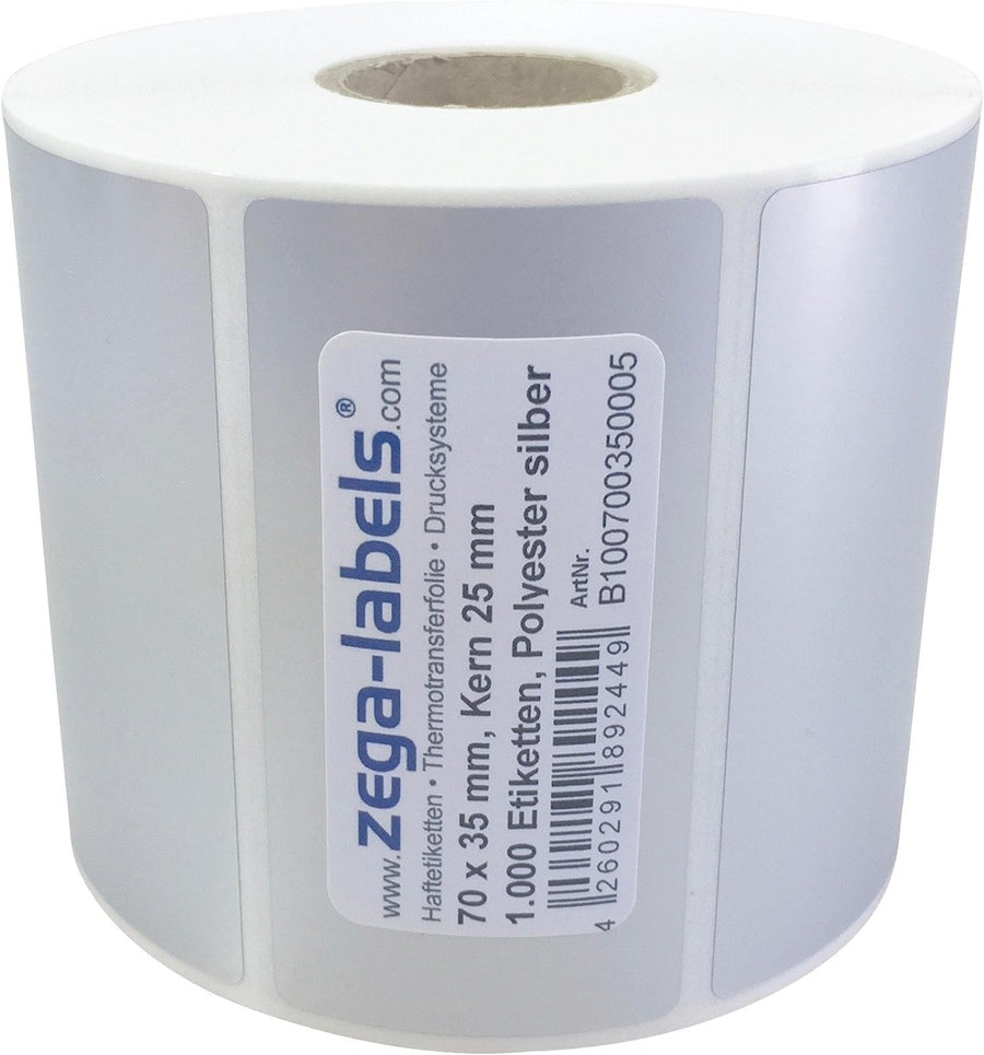 Polyester Thermotransfer Etiketten auf Rolle - 70 x 35 mm - aus PET Polyesterfolie silber für Typens