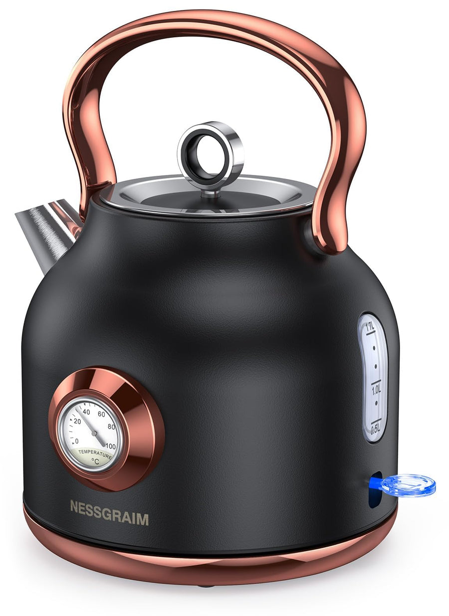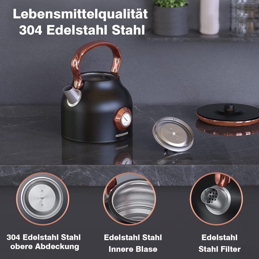 NESSGRAIM Retro Wasserkocher, 1,7 l Edelstahl-Teekessel mit Grosser Temperaturanzeige, 2200W Schnell