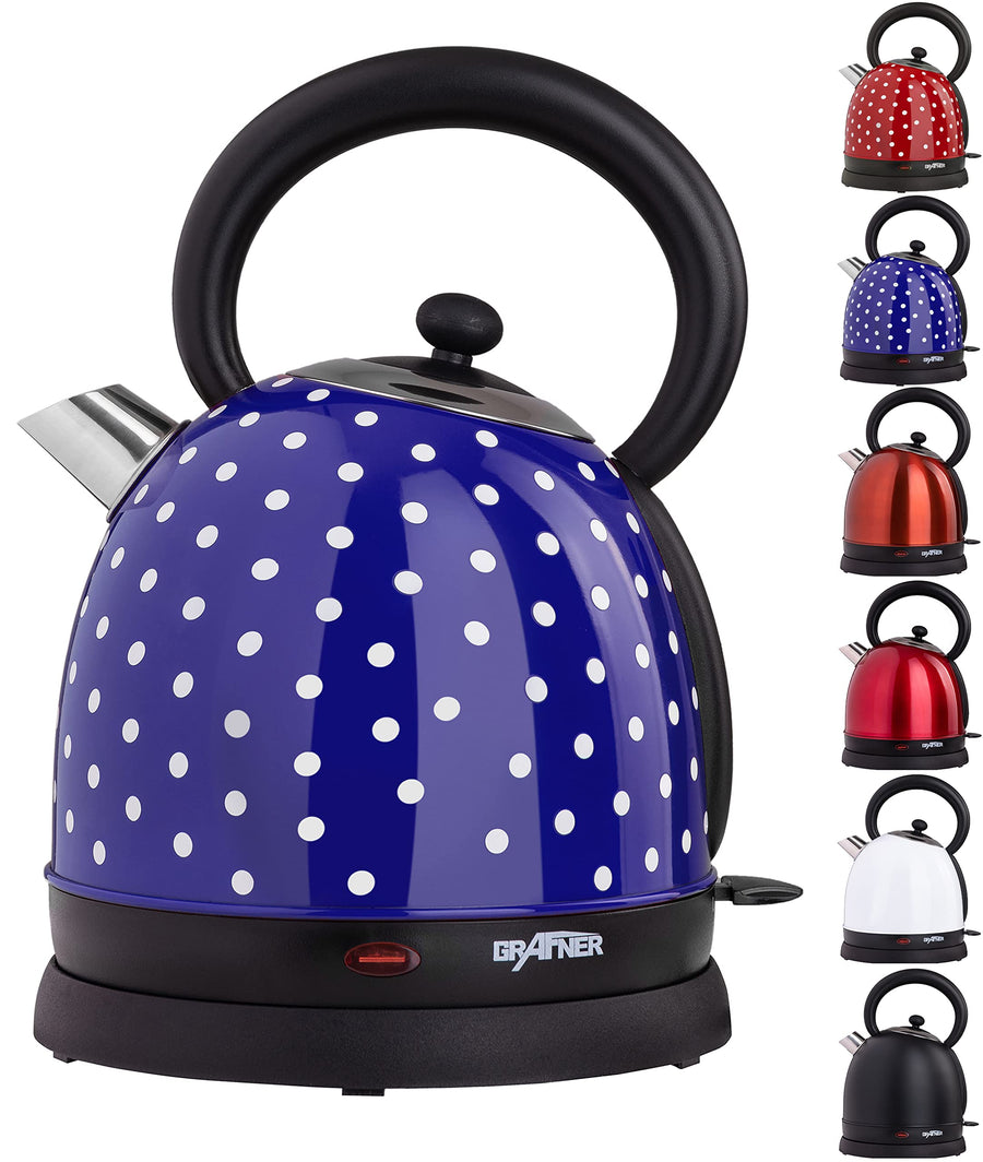 Grafner Retro Wasserkocher 2200 Watt, 1,8 Liter, Edelstahl-Korpus, Wunschfarbe, entnehmbarer Kalkfil