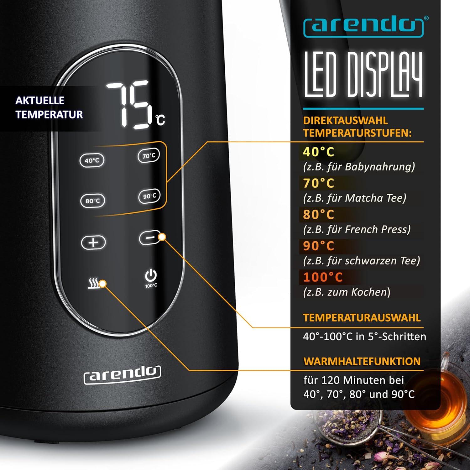 - PRODUKTVORTEILE: Wasserkocher 2200 Watt | Füllmenge: 1,7 Liter | Doppelwanddesign | Innengehäuse aus SUS304 Edelstahl | Grosses Body-LED-Display | Direktauswahl für 40°C, 70°C, 80°C, 90°C, 100°C | Frei einstellbare Temperaturen im Bereich von